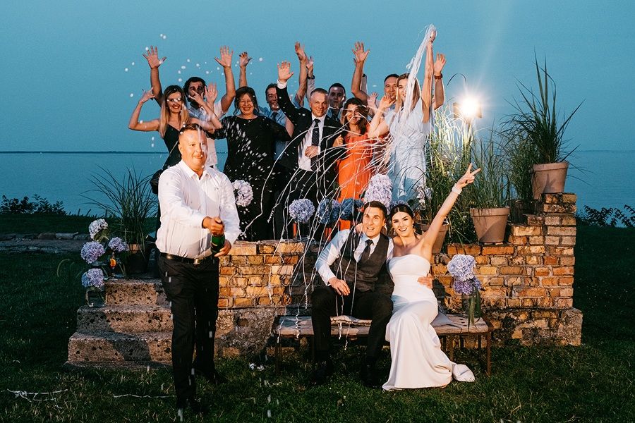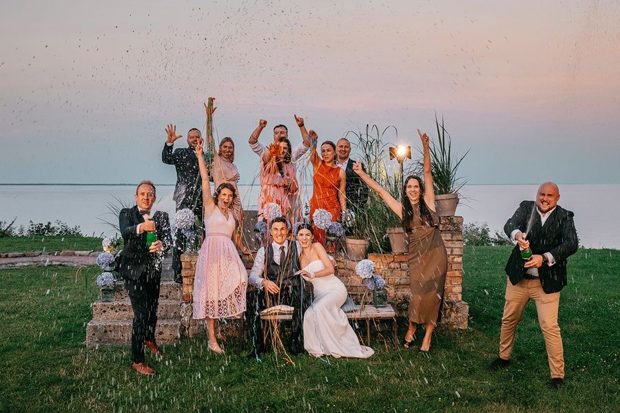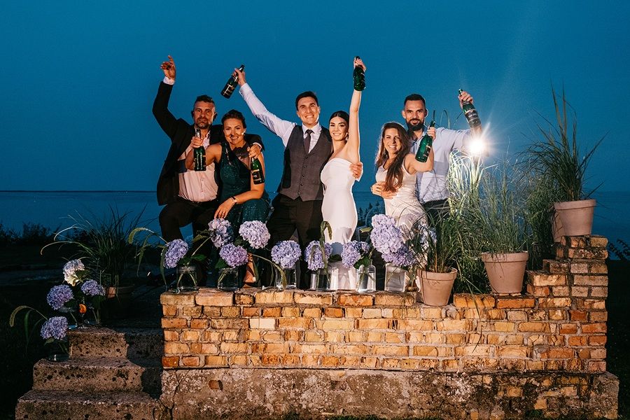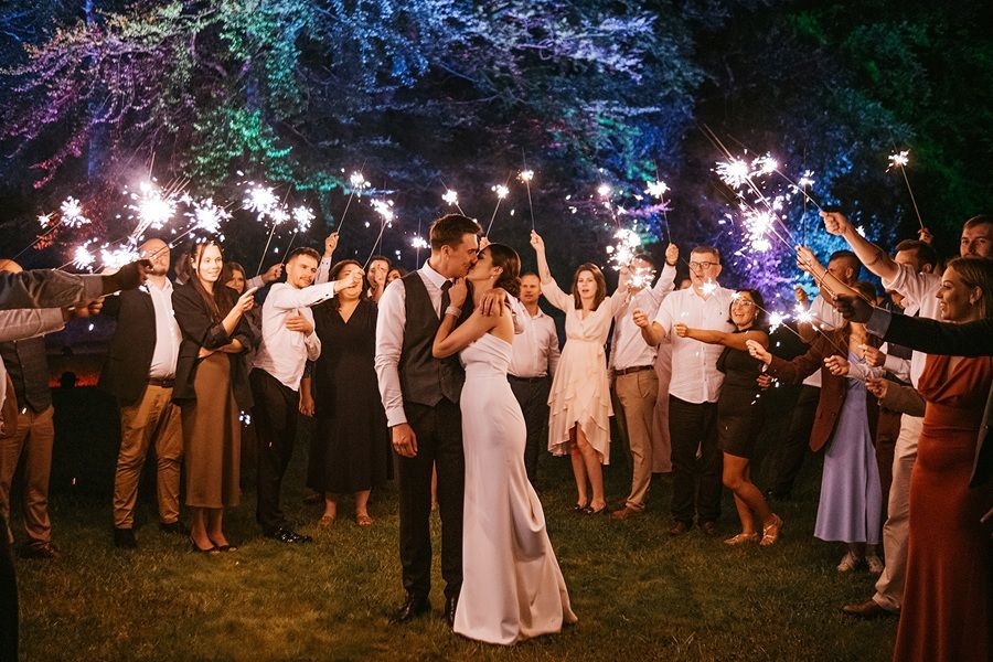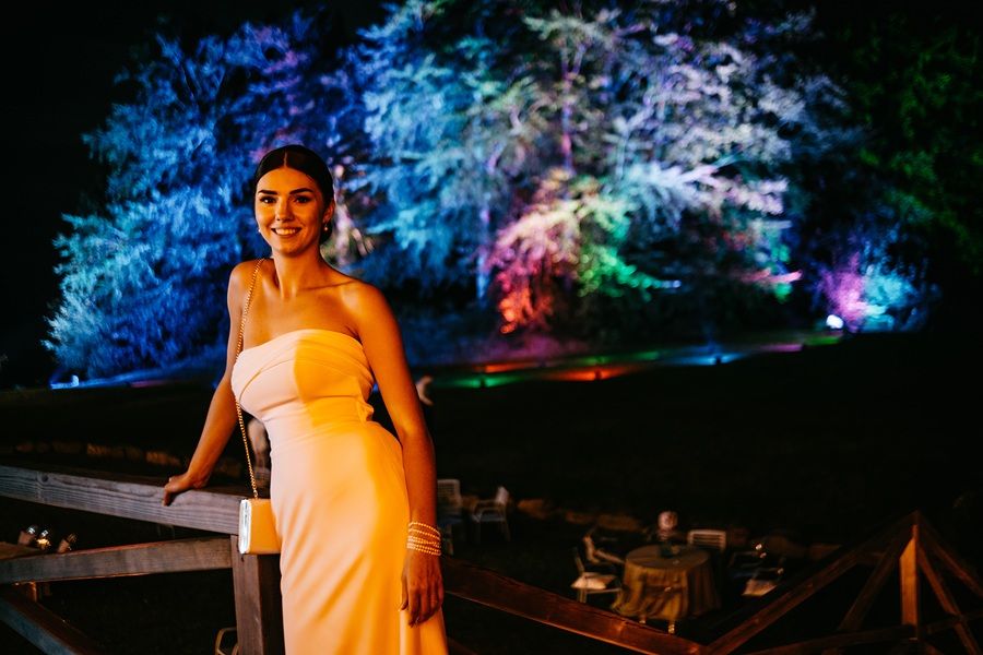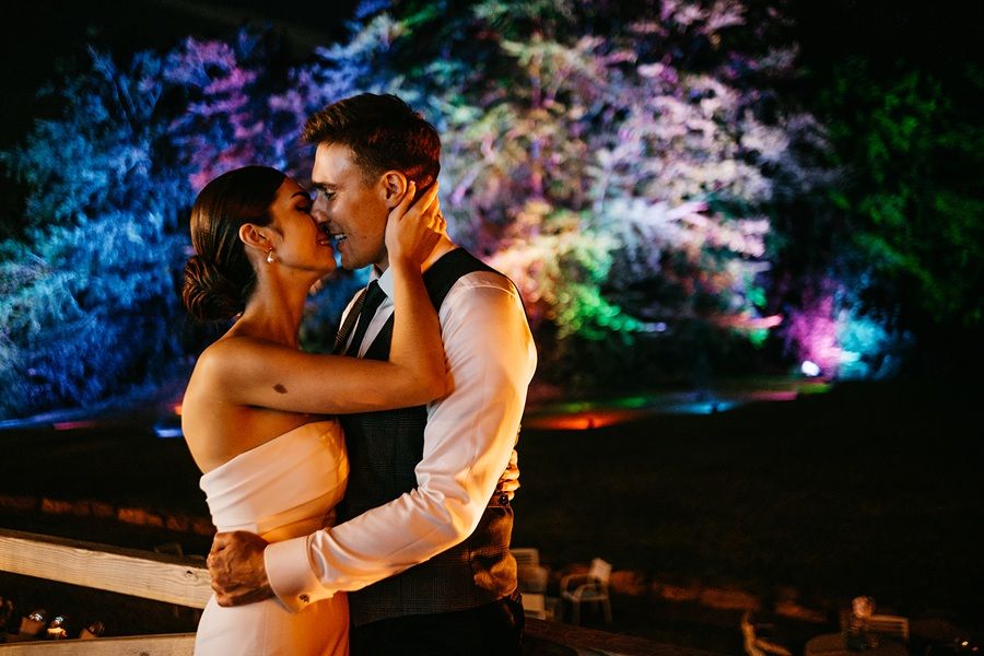 Podświetlane kompozycje dekoratorskie na stołach gości weselnych, oraz ścianki za Parą Młodą.